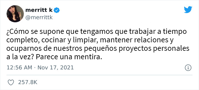 A principios de este mes, la escritora, editora y conductora de podcast merritt k preguntó en Twitter si es posible que trabajar a tiempo completo nos obligue a hacer muchos sacrificios, y parece que muchas personas ya se habían preguntado lo mismo, ya que, en unos pocos días, el tuit de esta mujer recibió más de 257 mil “me gusta” y muchísimas respuestas.