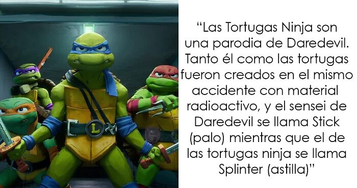 Hoy aprendí que las Tortugas ninja son una parodia de Daredevil (Marvel). Daredevil y las tortugas fueron creados en el mismo accidente con material radioactivo. Daredevil lucha contra el grupo malvado "la Mano" y las tortugas contra el clan del Pie. El maestro de Daredevil se llama Stick (palo) y el de las tortugas, Splinter (astilla).