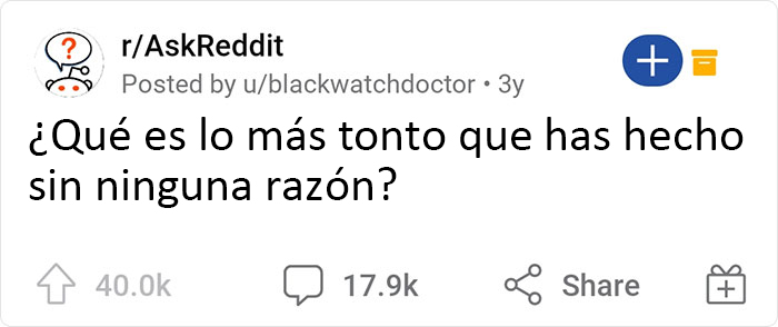 Así que cuando alguien preguntó “¿Qué es lo más tonto que has hecho sin ninguna razón?” sin saberlo, se abrió la caja de Pandora de algunas historias entretenidas. Piensa en meterte un chicle en el ojo sólo porque tu padre te dijo que no lo hicieras a cualquier precio, o en abrir la puerta de un coche en marcha sólo porque te preguntabas qué se sentiría.