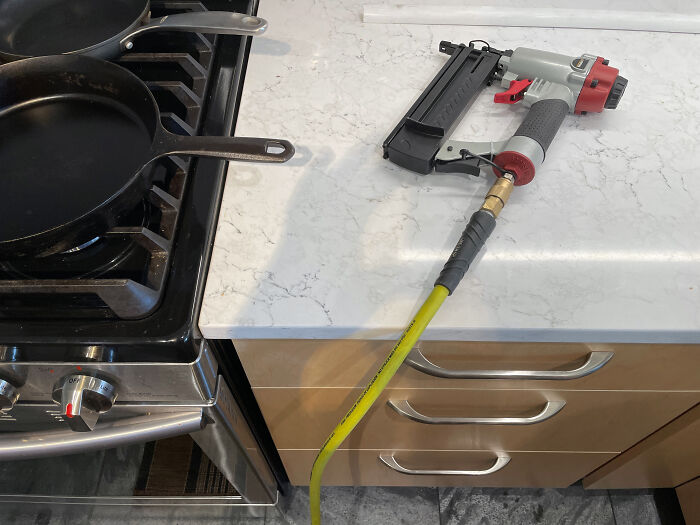 Ayer estaba usando una pistola de clavos en las molduras de las ventanas de mi casa. Como soy un idiota, decidí ver qué pasaba si disparaba a un centavo. El clavo rebotó en el penique, pasó por delante de mi cabeza y acabó en el frigorífico que tenía detrás. Por los pelos.