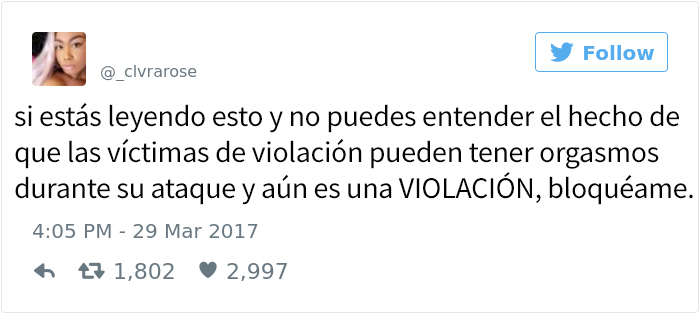Esta usuaria se hace llamar @_clvrarose en Twitter y The Rose en su blog personal, y publicó este hilo el pasado 29 de marzo. Con claridad innegable, abordó un lado de la violación a menudo ignorado, y que en algunos casos se usa como defensa de los violadores. El hilo tiene miles de likes y retuits, y creó una ola de entendimiento y apoyo.