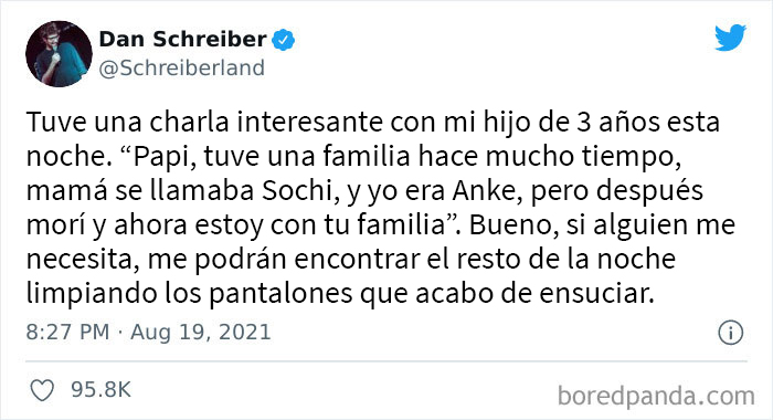 Cuando Dan Schreiber compartió algo particularmente espeluznante que su hijo le contó, las madres y los padres rápidamente se sumaron a su tuit, que se terminó convirtiendo en un hilo extrañamente gracioso, lleno de frases y conceptos que creerías que solo existen en las películas de terror. ¡Aquí tienen algunos de los mejores!