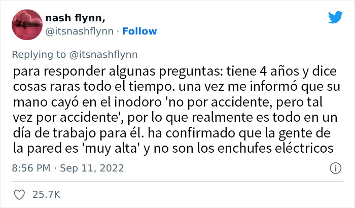A medida que los tuits de Flynn se hacían virales, otros usuarios de Twitter comenzaron a responder con experiencias propias similares. Desde el Sr. Boom hasta el Hombre Militar, sigue desplazándote para conocer las creaciones imaginarias (¡ojalá!) que se les ocurren a los niños.