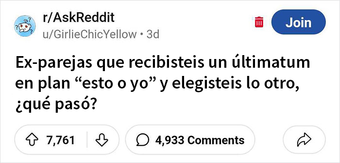 A veces, las personas piensan que los ultimátums son necesarios para comprometerse, lograr que la pareja abandone un hábito poco saludable y más cosas. Pero emitir uno no debe tomarse a la ligera, ya que siempre tienen el potencial de hacer estallar una relación. Los usuarios de Reddit han estado recordando ultimátums que les propusieron en sus relaciones anteriores, por lo que hemos recopilado algunas de sus historias más jugosas a continuación. Disfruta leyéndolas.