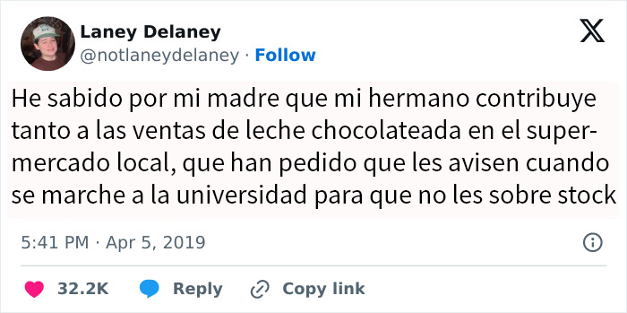 Pero comprar más de un determinado artículo que cualquier otra persona no es necesariamente algo de lo que debas avergonzarte, ¡porque quizá podrías ser el cliente más valioso de una tienda! El usuario de X, Laney Delaney, publicó sobre cómo su hermano contribuyó tanto a las ventas de leche con chocolate de su tienda local que querían estar informados de cuando se fuera a la universidad, y los lectores se sintieron inspirados para compartir sus propias historias similares. ¡Disfruta con las experiencias de estos apasionados clientes!