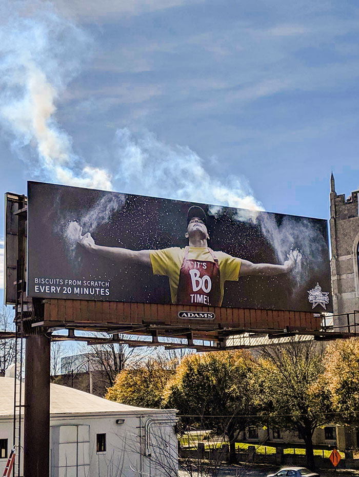 Para una idea de construcción de marca que generaría algo de interés y participación en línea durante el fin de semana All-Star de la NBA de la semana pasada, LGA creó una valla publicitaria llamativa para los famosos Chicken n 'Biscuits de Bojangles, con sede en Charlotte, que simula uno de los rituales más populares antes del juego y el ingrediente más importante de las famosas galletas. La valla publicitaria celebra a las estrellas del desayuno de la cadena, Master Biscuit Makers, mostrando la dramática imagen de un verdadero fabricante de galletas lanzando harina al aire como un atleta. Para agregar a la acción, la valla publicitaria dispara periódicamente harina simulada, usando una máquina de humo, para representar que Bojangles hornea sus galletas hechas desde cero cada 20 minutos.