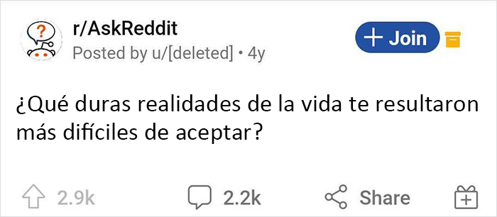 Los usuarios de Reddit se han sincerado sobre las realidades brutales de la vida que más les afectan, así que hemos recopilado algunas de sus respuestas más reveladoras y desgarradoras. Si tú también estás luchando con alguna de estas ideas, que sepas que no estás solo, panda. Acuérdate de votar las píldoras que te hayan resultado especialmente difíciles de tragar y, si te interesa profundizar aún más en este tema, puedes encontrar otro artículo de PandaCurioso con un debate similar aquí.